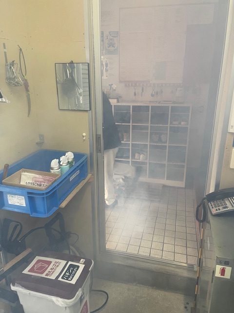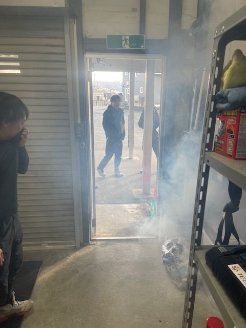 訓練を実施し、重大な課題が浮き彫りになりました。通常1階には社員がいなく業務はすべて2階で実施している。自動火災報知設備の設置義務はなく、警備会社の提供する火災報知器のみでドアの開閉で通常も警報音が鳴動する。煙を発生させ、警報音が鳴動するも2階にいる社員が誰も気づかず10分経過し、15分後煙が2階に上がり火災と認識し避難開始。社長様と訓練の振り返りを行い、以前は1階で業務を行っていたが、「現況での設備更新が必要だとこの訓練で認識できた」と話す。そして、お客様と社員の命を守るためすぐに2階に警報設備を取り付けるとそこでも判断のスピードに驚かされました。それだけでなく、義務ではないが消防計画も作成すると語る。法律は最低限の義務であり、「法律とおりにやっていたら命を守れる」とは違います。今回の訓練経て経営としても当社は学ぶことができ素晴らしい訓練となりました。