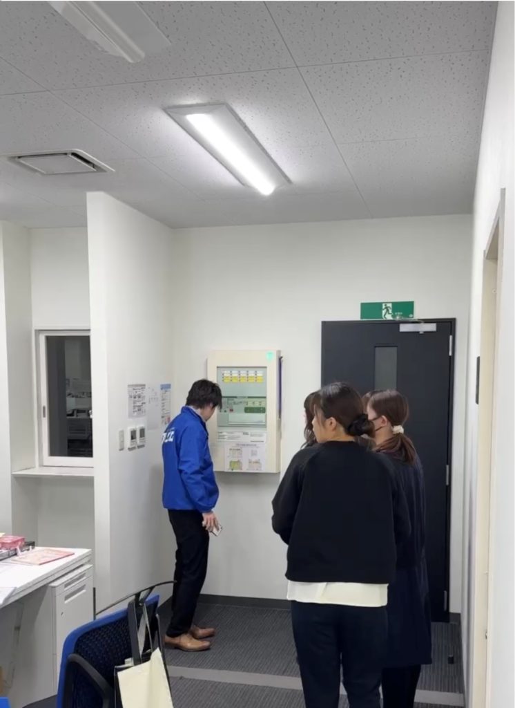 自動火災報知設備の受信機に集合し、火元を確認し、それぞれの役割を指示。事前の講習会で消防設備の取り扱いを習得しているので、警戒区域図と照らし合わせ火元エリアを確認し、初期消火、避難誘導を実施。